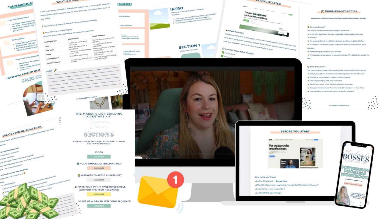 The Maker’s List-Building Kickstart Kit is a supportive, step-by-step mini course designed for handmade sellers who want to grow their audience — without pressure or perfectionism.